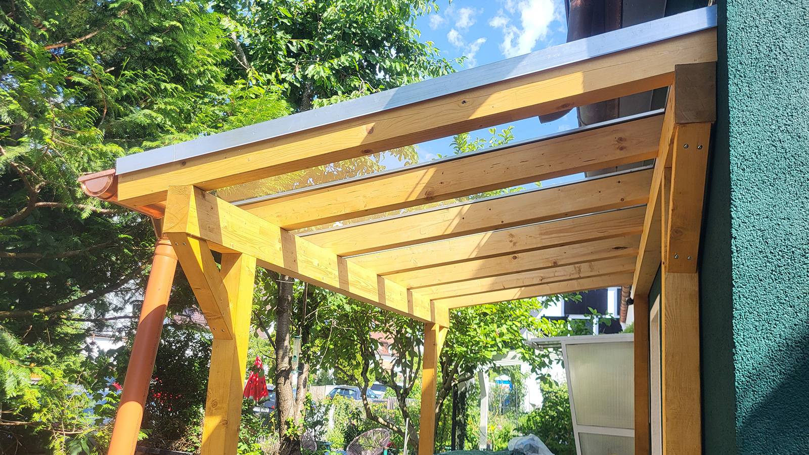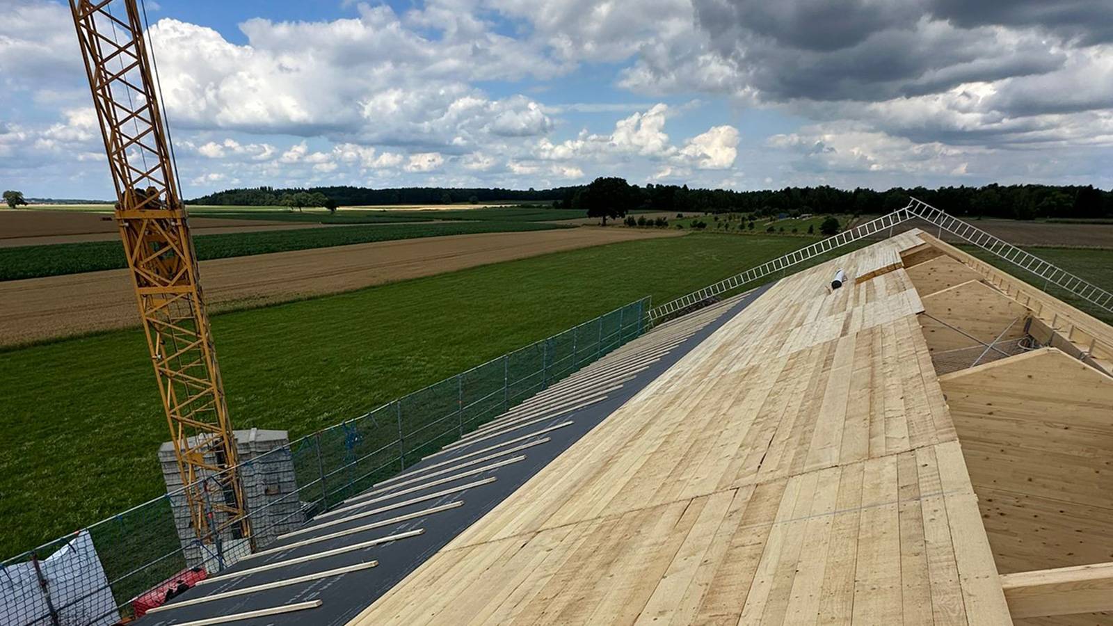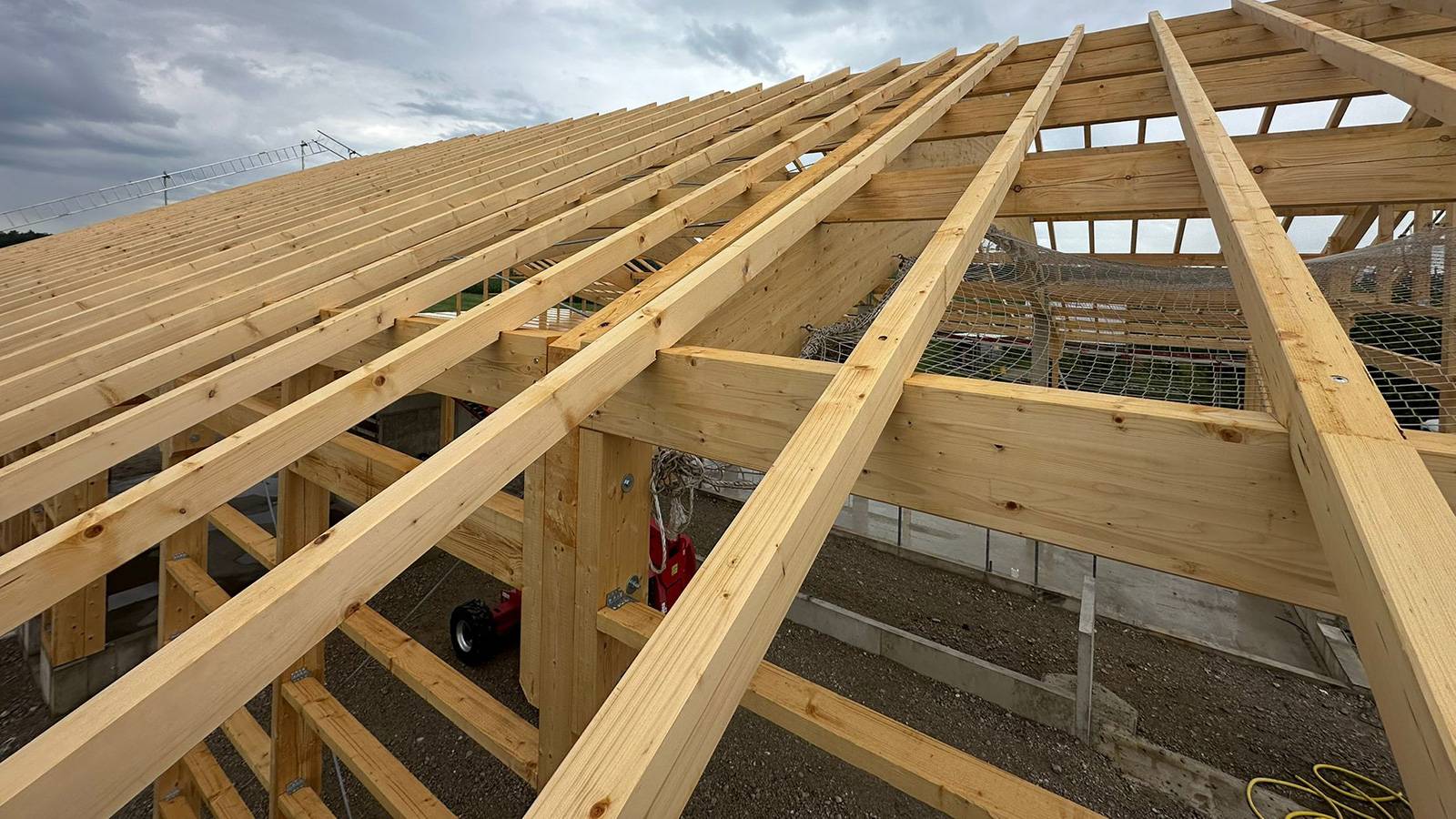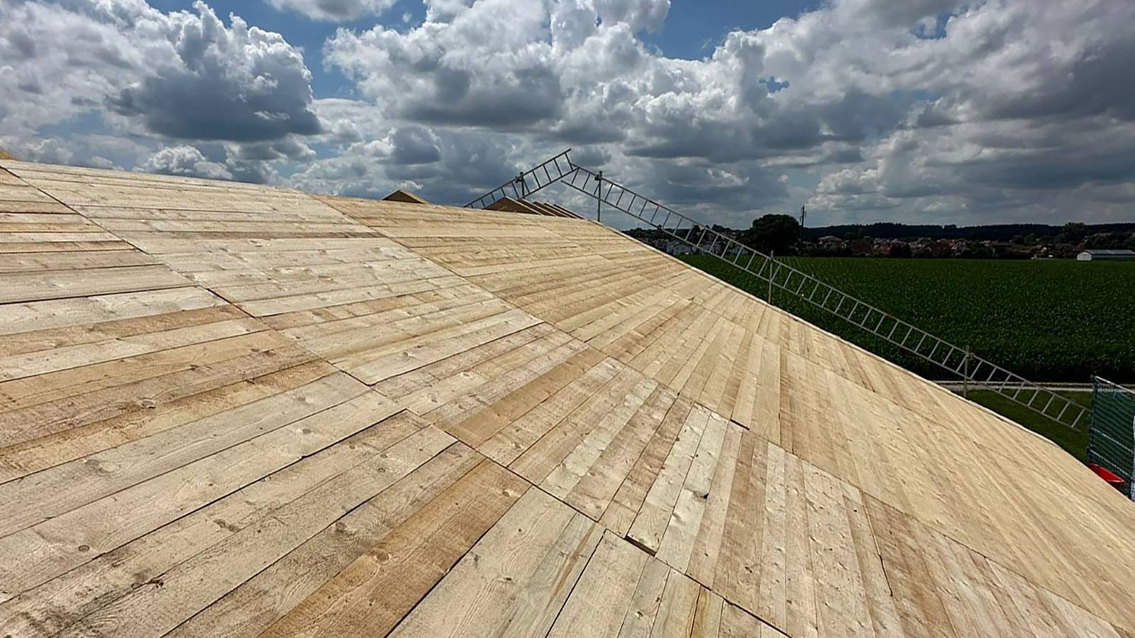 Die Holzdachkonstruktion wurde als mehrschichtiges System konzipiert, das sowohl Schutz vor Wind und Wetter bietet als auch maximale Tragfähigkeit sicherstellt. Entscheidend für die Stabilität und Langlebigkeit ist die sorgfältige Verarbeitung der einzelnen Schichten. Im Fokus stand dabei die Lattung, bestehend aus Dachlatten und Konterlattung. Diese bildet das Bindeglied zwischen der tragenden Holzkonstruktion und der abschließenden Bedachung und sorgt für eine stabile Basis, auf der sämtliche weiteren Dachschichten zuverlässig aufbauen. Ergänzend kam eine hochwertige Unterdeckbahn zum Einsatz, die das Eindringen von Feuchtigkeit in die Konstruktion verhindert und so das Holz dauerhaft schützt.