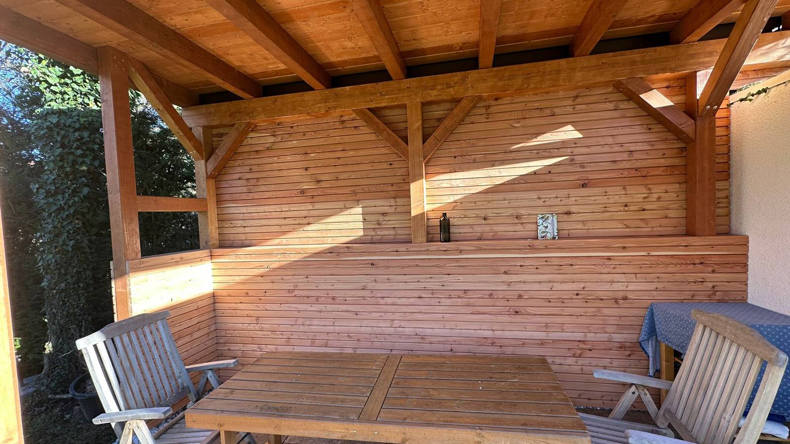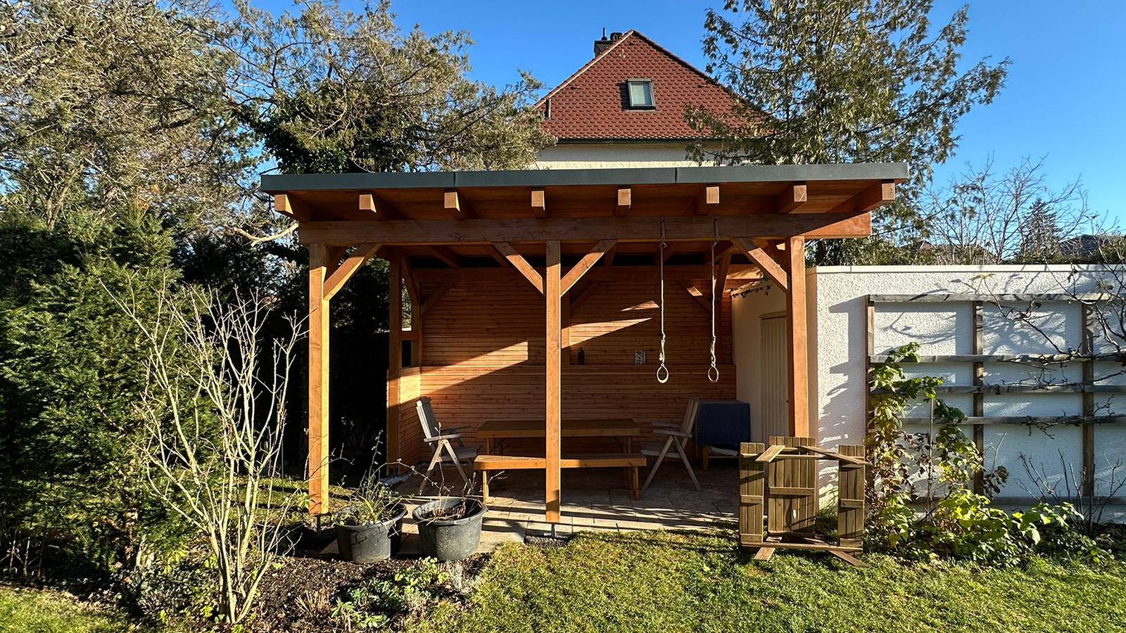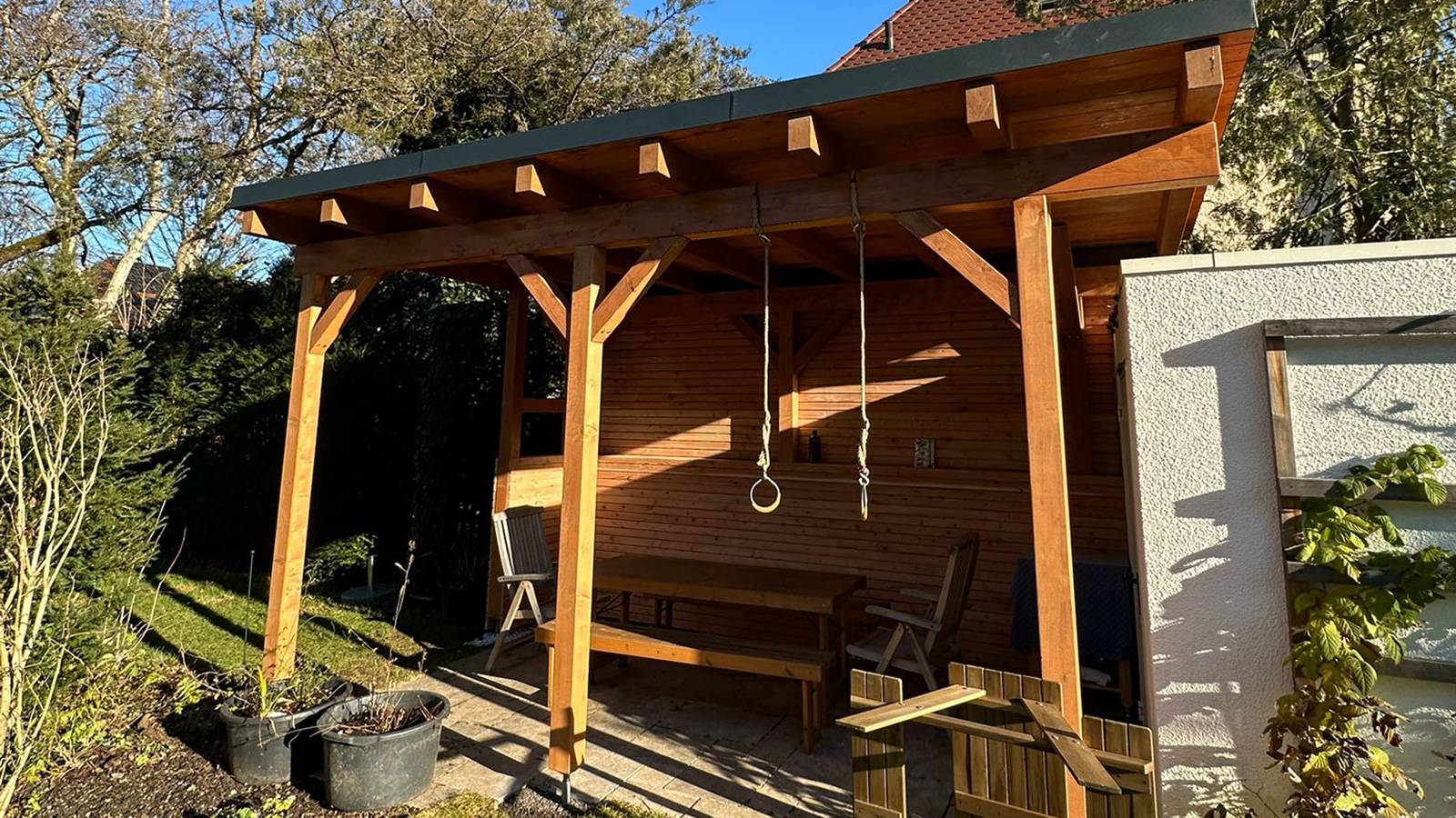 Die Pergola wurde exakt an die Gegebenheiten des Gartens angepasst und vollständig aus hochwertigem Konstruktionsholz gefertigt. Für die Seiten kam eine elegante Sichtschalung aus Rhombusleisten zum Einsatz, die sowohl Schutz als auch durch Ihre Ästhetik begeistert.