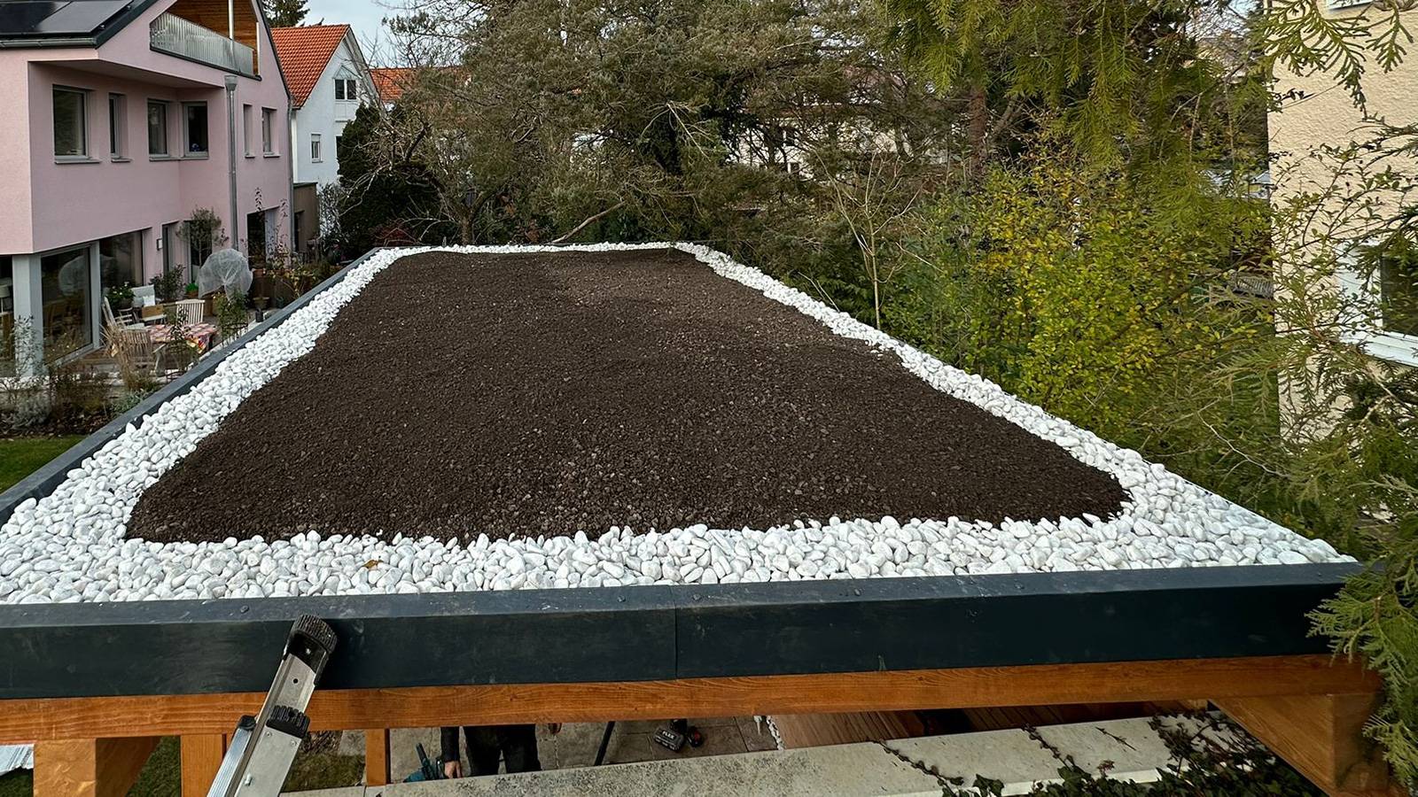 Das Gründach verbessert das Mikroklima, schützt vor direkter Sonneneinstrahlung und bietet natürlichen Regen- und Hitzeschutz. So entsteht eine wunderschöne Sitzmöglichkeit mitten im Garten, die auch bei schlechtem Wetter zum Verweilen einlädt.